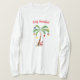 Camisa de manga longa feminina mostrada em Branco com um impressão de palmeira festivo com texto de Feliz Navidad. Perfeito para os feriados. Personalize este item ou comprar como está.