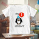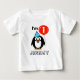 Camisa de primeiro aniversario de bebês personalizadas para uma criança de um ano. Um desenho animado de pinguim com balão vermelho e chapéu de festa. Nome personalizável e número de idade. Design para a festa de primeiro aniversario de criança. Primeira ideia de presente de aniversário.