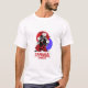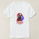 A camiseta apresenta uma poderosa silhueta guerreira, erguida em uma pose heroica. O guerreiro é enfeitado numa armadura antiga, com detalhes intrincados como um capacete decorado, ombros fortes e uma placa de peito resistente. A sua posição é confiante, com um braço levantado, segurando uma espada que brilha com energia etérea. Atrás do guerreiro está presente um escudo feroz e brilhante, simbolizando a proteção e a força.
