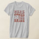 Camisa cinza engraçada e fofa de solteira para a noiva. Texto simples que diz Aqui vem a noiva com letras cor-de-rosa e um anel cor-de-rosa.