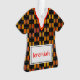 Ornamento de camisa kente único com retângulo para o nome ou a palavra de sua escolha na frente e no verso. O padrão K30 tem preto com pinstripes brancas e quadrados kente multicolorido contrastantes acabados com uma linha de pescoço curvada vermelha. - Outras designs de camisa kente estão disponíveis para fazer um tipo SET para várias pessoas!