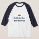 Mostrada em uma camisa de baseball do estilo raglan e em azul e branco Marinho. Pequeno gráfico da bandeira americana com texto de "é hora das eleições, vamos rezar". Carregue sua própria foto ou comprar, conforme mostrado.