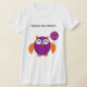 Esta camisa apresenta uma coruja fofa com os olhos fechados como se estivesse dormindo e garras bonitinhas. Seu corpo é roxo e suas asas, ouvidos e garras e bico são laranja. A coruja está segurando um balão com "Feliz Halloween" escrito sobre ele e pronto para festas. Há um texto roxo em negrito sobre a flor que diz "Trick or tweet". Este texto é personalizável, permitindo que você o personalize se quiser. Presente perfeito para o Halloween.
