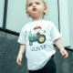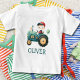 Esta camiseta personalizada para crianças pequenas apresenta um menino caprichoso em um trator verde fofo.