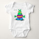 Esta imagem apresenta uma peça branca de bebê impressa com uma alienígena verde de desenho animado, sentada numa pose relaxada, vestindo uma camisa listrada, jeans azuis e tênis — a língua jogando fora. O texto "seu texto" acima sugere que este é um design personalizável. O peculiar personagem de trás faz dele uma escolha divertida e imaginativa para o visto personalizado de bebês — perfeito para fãs de ficção científica ou como presente caprichoso para pequenos extraterrestres.