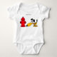 Esta imagem mostra uma roupa branca para bebês impressa com um cão amarelo de desenho animado tocando sua perna para fazer xixi em um hidrante vermelho — uma cena clássica, humorística. O texto "seu texto" acima sugere que este é um design personalizável. A ilustração icônica e reluzente faz dela uma escolha divertida e reconhecível para o visto personalizado de bebês — perfeita para amantes de cachorros ou como um presente viscoso e adorável.