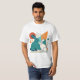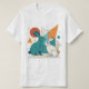 Camiseta geométrica com dois coelhos em ilustração artística. Uma t-shirt branca com ilustração de dois coelhos, um azul e um branco, colocada sobre um fundo geométrico com formas laranja e azul.