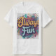 Diversão GeométricaUma camiseta ousada e na moda com a frase "sempre divertido" em cores contrastantes contra um fundo de padrão geométrico.