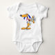 Esta foto mostra um traje de bebê branco, decorado com um cão de desenho animado vestido de médico, segurando uma seringa grande e uma prancheta. A design lúdica e humorística traz um toque leve à roupa de bebê.