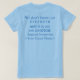 Muitas causas usam a faixa de reconhecimento azul-claro. A arte da camisa apresenta uma pintura de fita de reconhecimento azul-claro. A mensagem da camiseta de conscientização anota "Acredite na esperança de adicionar sua causa aqui". Na parte de trás da camisa está a mensagem de causa "Não conhecemos a nossa FORÇA até que seja a nossa única escolha. Apoiar a sensibilização<Add Your Cause Name>". Adicione seu nome de causa. Todo o texto pode ser alterado. Em vez da palavra "ESPERANÇA", poderia utilizar-se a palavra "CURE". A cor da fita de sensibilização azul-clara significa apoio ao cancer da próstata, à Trisomia 18, à Doença de Addison, Linfedema, à Doença de Behcet, à Síndrome de Transfusão Gêmea-Gêmea (TTTS) e aos Pets Spay e Neuter. A doença da tireoide usa fitas de reconhecimento azul claro e azul paisley. Que esta fita de consciência azul leve ajude a conscientizar essas causas! A roupa da fita de reconhecimento azul clara pode ser personalizada com mensagens personalizadas para fazer roupas de evento para excelentes de arrecadação de fundos, camisas de caminhada em grupo, presentes de camisetas de conscientização ou outras ocasiões de eventos de causas especiais para a mercadoria para ajudar a aumentar a conscientização da causa em público para a ajuda da sociedade em criar ajuda e causar mudanças.