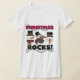 Três homens de neve, notas musicais, e texto que lê as Rochas de Natal nas design de Natal, camisas de neve, capuzes, canecas, cartões, adesivos, t-shirts, sacos de tote, e muito mais.