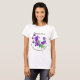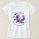 Flor roxa com hastes Ervilhas-de-cheiro botânica do artista na Camiseta com texto. A escrita na camisa fornece o nome botânico e os países de origem. A flor delicada e bonita traz uma mensagem para os amantes da natureza e um lembrete da beleza natural da terra.