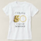 Para uma t-shirt branca/clara. Personalize e adicione sua foto. Texto: Celebrando 50 anos de casamento. O número 5 é escrito com uma fonte de estilo de balão. Fotograma de ouro falsa.