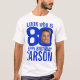 80 de aniversário azul e branco, olhe quem tem 80 fotos personalizadas e dê um nome para t-shirt. 80 personalizado com fotos reais, azul brilhante e design de aniversário branco. Personalize esta camisa de aniversário com uma fotografia do aniversariante ou rapariga no meio do número 0. Excelente ideia de adicionar diversão a um marco de 80 anos. Outros itens e cores correspondentes estão disponíveis. design exclusivo de Sarah Trett para www.mylittleeden.com