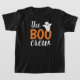 A família moderna que combina a camisa do Dia das Bruxas design apresenta o texto "The Boo Crew" em letras laranja e brancas com um pequeno sotaque fantasma. Encomenda cada membro da sua tripulação.
