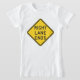 Este design é um sinal de estrada das extremidades da pista do direito. O sinal é amarelo com escrita preta nele. Este design do sinal de estrada das extremidades da pista do direito olha grande neste t-shirt das meninas