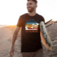 Prepare-se para se despedir da escola porque o verão está quase aqui! Apresentamos nossa mais recente t-shirt gráfica casual, com uma paleta colorida impressionante dos anos 70, com vibrações retrovisoras do pôr do sol. As riscas marinho azul, amarela, laranja e vermelha complementam perfeitamente a silhueta surfista caminhando em uma praia de palmeiras com ondas caindo ao fundo. Esta camisa é a última peça de declaração de verão que te fará sentir na moda e confiante. Não perca essa adição obrigatória ao seu guarda-roupa!