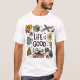 Esta camiseta é perfeita para quem ama livros, música, comida e viagem. Ele apresenta uma colagem colorida de fotos ou desenhos desses quatro elementos, junto com as palavras "A vida é boa" em uma fonte manuscrita. Se você está procurando por um presente único e ponderado para alguém que ama livros, música, comida e viagem, esta camiseta é uma escolha de excelente. Isso vai lembrá-los das coisas boas na vida e fazê-los sorrir toda vez que eles a usam.
