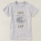 Camiseta tipográfica em preto e branco com a frase, "A vida é melhor com um gato no colo" e no lugar da palavra gato é um esboço de um gato fofinho sorrindo. Concebido por Robin; imagem de gato usada neste item é oficialmente licenciada / © Graphics Fatory.com