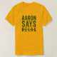 Aaron diz relaxa (RELAXE) o t-shirt com rotulação verde afligida.