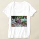 Camiseta Nano con cuello V y rama de acebo con bayas moradas en relieve con efecto metálico sobre un fondo abstracto con motivos florales.