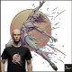 Style & Background: The figure is set against a large, glowing orange/yellow circular shape, which acts as a radial backdrop. Colorful streaks and splatters of pink, blue, yellow, and orange radiate outwards, emphasizing the energy of the movement. The style is intense, graphic, and uses a neon pop art aesthetic.