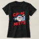 Um design de beisebol lúdico e humorístico, com personagem de baseball em cartoon com olhos expressivos, vestindo um boné e segurando um taco. O plano de fundo inclui um padrão de tabuleiro azul e branco, adicionando um elemento dinâmico. A frase "Acalme seus Mitts" é exibida em texto vermelho em negrito, enfatizando o tom alegre e iluminado. Perfeito para visto casual ou mercadoria para entusiastas do beisebol que apreciam o humor.