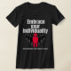Aceite sua individualidade. Celebre o Dia Internacional da Camiseta. Esta imagem mostra uma mensagem ousada defendendo a individualidade, encorajando as pessoas a abraçar suas qualidades únicas. O texto "Abraçar sua individualidade" é escrito em letras grandes e negras no topo, enfatizando sua importância. Abaixo da mensagem, aparece um grupo de figuras de pau, cada uma a preto, exceto uma no centro, que se destaca em vermelho vibrante. Este contraste reforça visualmente a mensagem de abraçar a singularidade de cada um. O slogan "Dia Internacional da Camisa (21-junho)", na parte inferior, sugere que esta mensagem coincide com o dia em que se celebra a expressão pessoal através da roupa. O design geral da imagem é simples mas eficaz, oferecendo uma poderosa mensagem de autoaceitação e celebração da diversidade.