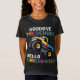 Um legal design de graduação na pré-escola de um dinossauro t rex montando um caminhão monstro "Goodbye Preschool Hello Kindergarten" para crianças, filho, filha, irmão neto, meninos, meninas, que tem formando este ano na pré-escola ou no Primeiro dia do infantário.