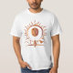 The T-shirt showcases a striking orange motorcycle helmet at its center, encircled by a radiant sun with flowing rays. Below the helmet, a rider on a motorcycle is depicted, set against a backdrop of rugged mountains. The entire design is rendered in a cohesive orange and white color scheme, creating a visually impactful and adventurous aesthetic.