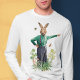 Legal design que apresenta um coelho em roupas de rico num campo de flores.