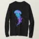 Água-viva grande, azul, desenhada artisticamente, brilhante, brilhante, com longos tentáculos sobre fundo preto com bioluminescência roxa. Água-viva luminosa.