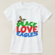 Uma bela águia sobre as palavras bonito Peace Love Eagles em verde, vermelho e azul.