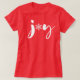 Mostre seu espírito de Natal com esta camisa de mulher na moda em cores clássicas de Natal vermelho e branco. A design de tendência inclui a palavra "alegria" manchada com um floco de neve para o.