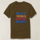 A camiseta "Almas Bravas Unidas Corações" apresenta uma imagem ousada e central de corações entrelaçados, simbolizando unidade e coragem. O design incorpora cores vibrantes e padrões sutis e abstrato, representando força e resiliência. A frase "Corações Unidos das Almas Bravas" é elegantemente escrita abaixo, incorporando solidariedade e o espírito destemido de união.