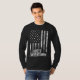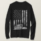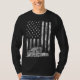 Celebrate the spirit of the open road with this patriotic long-sleeve shirt featuring a white semi-truck outline set against a vertically stretched, distressed American flag. The black backdrop and rugged textures make this a bold tribute to freedom, horsepower, and the pride of American truckers.