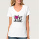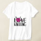 Adoro tricotar camiseta de slogan. Apresentando uma ilustração de bola em forma de coração no lugar do o na palavra amor. Uma t-shirt bonita ideal para tricô e grupos de tricô. Gráficos originais por Sarah Trett.