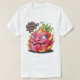 Uma fruta de dragão colorida é representada com a boca bem aberta, parecendo um rugido. As frutas vibrantes, cor-de-rosa e escamas verdes, acrescentam sua aparência mítica.