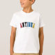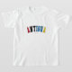 Verifique para fora este t-shirt de Antígua nas cores da bandeira nacional de Antígua! É você de Antígua? Você tem um amigo ou um membro da família que amem Antígua? Em caso afirmativo, este t-shirt da "bandeira" é exatamente o presente que você está procurando! As características de design "Antígua" na rotulação vermelha, preta, azul e amarela arqueada na pia batismal clássica da faculdade.