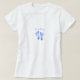 Uma camiseta de anúncio de nascimento de um bebê com pegadas azuis giras contra um fundo azul macio. Personalize adicionando o nome do seu bebê ao texto personalizável que diz: É um menino. Perfeito para a futura mãe vestir no chá de fraldas.