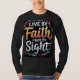 Saia em confiança com esta design ousada baseada na fé, com a frase "Viva pela Fé, não pela Visão." A impressionante tipografia no estilo 3D com sotaques brilhantes faz com que esta camisa seja pop em qualquer fundo colorido. Um lembrete para caminhar na fé, confiar no plano de Deus, e nunca deixar que o medo o atrapalhe. Perfeito para crentes que querem fazer uma declaração ousada de fé no dia a dia. impressão Premium Concebido para cores escuras e leves, com permissão para vestir o dia a dia ou como presente