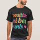O design t-shirt apresenta a frase elevatória "Positive Vibes Only" numa fonte vibrante e multicolorido. O texto pretende difundir positividade e otimismo, encorajando os usuários a se concentrarem no bem da vida. As cores utilizadas são brilhantes e alegres, criando uma vibração feliz e enérgica. O design é limpo e minimalista, permitindo que a mensagem fique no palco central.