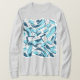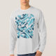 Um design de arte contemporânea brilhante, mas suave e pastel é composto por pequenas formas dispersas em aqua e turquesa com uma inclinação diagonal total em relação ao padrão de abstrato. Foto aqui em uma camiseta de manga longa "cinza", com outros estilos e cores disponíveis. Trata-se de um olhar vivo, festivo e criativo para o visto casual e cotidiano, que funciona para a maior parte de suas atividades (do trabalho/escola ao esporte ao relaxamento/socialização ao trabalho em execução), mas também trabalha para ocasiões um pouco mais difíceis, dados os temas artísticos, que contribuem para um sentimento de "união" e um estilo personalizado. Especialmente para aqueles que trabalham remotamente e/ou passam muito tempo em casa, as roupas podem ser divertidas novamente.