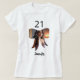 Uma t-shirt branca, de cor clara, decorada com um quadro fotográfico em forma de arco. Personalize e adicione um nome e uma idade. Script de estilo manuscrito preto.