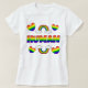 Camiseta LGBTQIA com corações e letras em arco-íris.