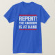 Arrependido! O reino é texto branco à mão. Linhas vermelhas. Camisa azul.