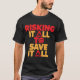 Esta t-shirt preta apresenta o texto "RISKING IT ALL" no topo numa letra vermelha a negrito. Abaixo, "TO" está empilhado sobre uma forma cardíaca, ambos em vermelho. A frase "SALVAR TUDO" está na parte inferior em uma fonte amarela em negrito. Gráficos de chama estilizados são incorporados às palavras "TI" nas frases superior e inferior. Esta design homenageia a bravura e dedicação dos bombeiros.