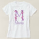 Pintado mão bonito no monograma da aguarela M com as orquídeas selvagens cor-de-rosa torceu ao redor o t-shirt roxo do nome e do significado da letra M. Ideal para um presente personalizado para uma menina que tenha um começo conhecido com M. Este exemplo lê a estrela amado de Maria do mar. Uma beleza ou você natural podem personalizar o texto com suas próprias palavras do nome e do significado se for necessário. Ideal como um presente especial do aniversário ou da celebração. Se você precisa a ajuda com seu próprio nome personalizado por favor contacte-me. Pintura lunática tipográfica principal da aguarela da orquídea do © da letra M por Sarah Trett. www.sarahtrett.com para www.mylittleeden.com