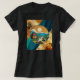 Na moda e camiseta confortável em abstrato, misturar design com ondas em tons de bule e pedra mármore de textura laranja, vermelha e preta. Arte pitoresca japonesa com sol, montanhas com capa de neve, barcos fluviais e casas. Inspirado pela arte histórica do estilo impressão japonês. Casual à moda, quadril e moda faz disso uma adição única ao seu guarda-roupa.