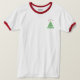 Árvore de Natal com "Feliz Natal!" arqueado sobre o topo. A árvore é uma imagem estilizada criada com linhas horizontais verdes. Posicionada na "área do bolso" da frente.